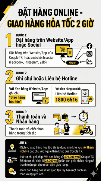 Không còn lo lắng khi cần outfit gấp hay quà tặng bất ngờ. Với dịch vụ giao hàng hỏa tốc Couple TX, bạn sẽ luôn sẵn sàng trong mọi khoảnh khắc – nhanh chóng, tiện lợi và trọn vẹn hơn bao giờ hết.